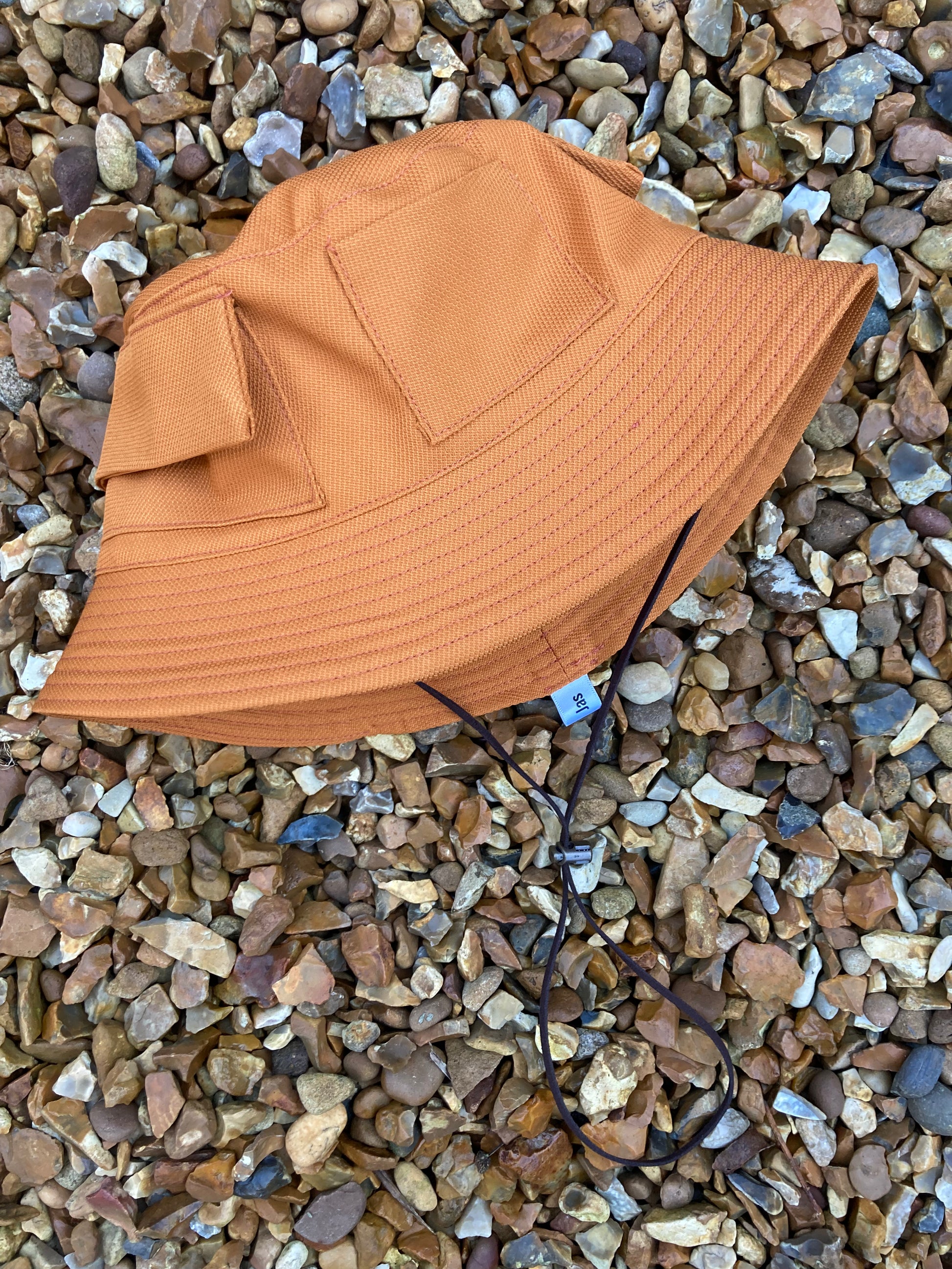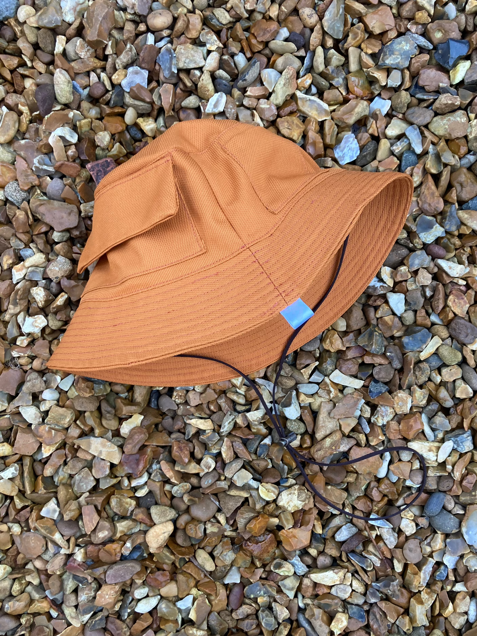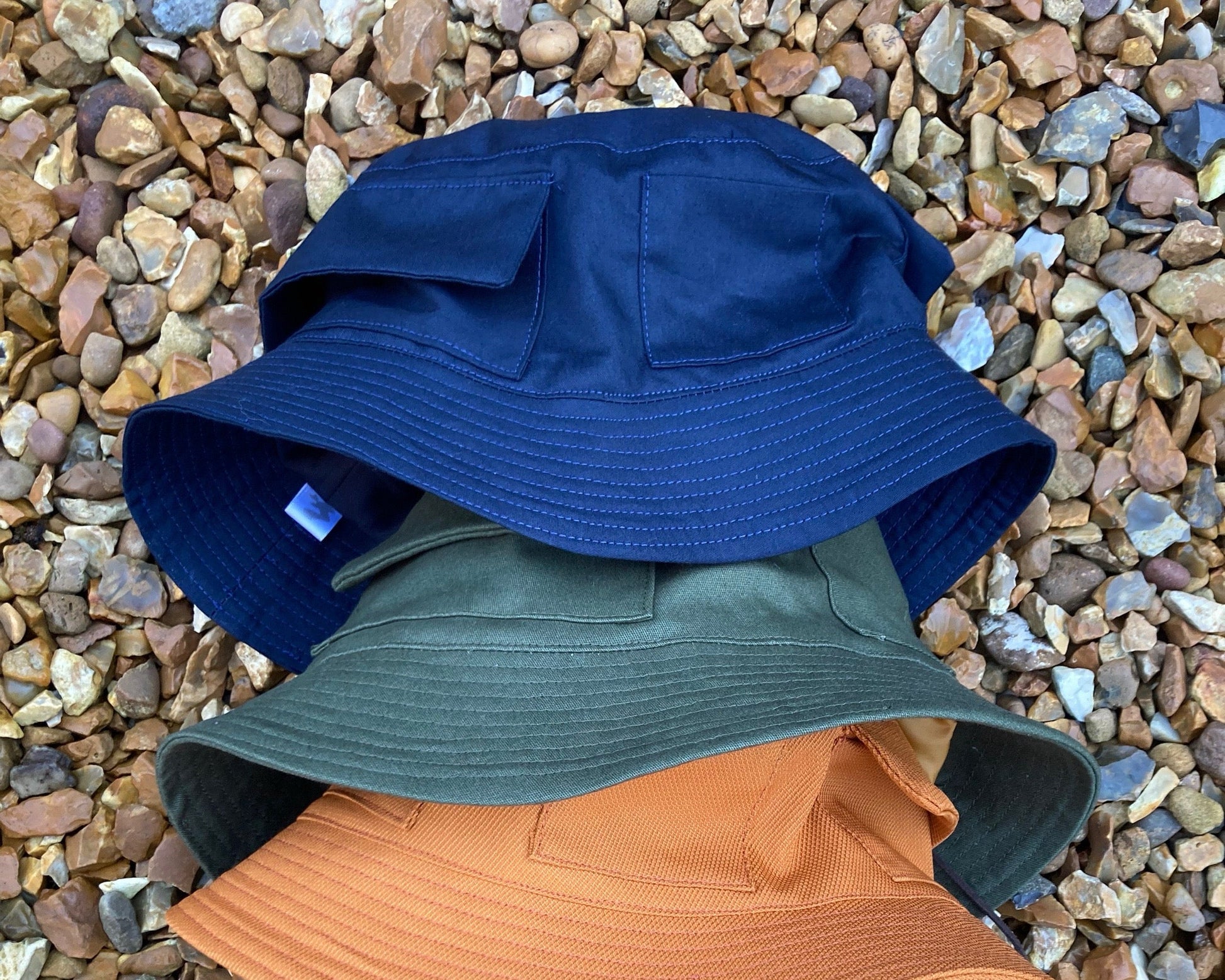 Textured water repellant utility stash bucket hat with detachable toggle chin strap and four mini patch pockets.