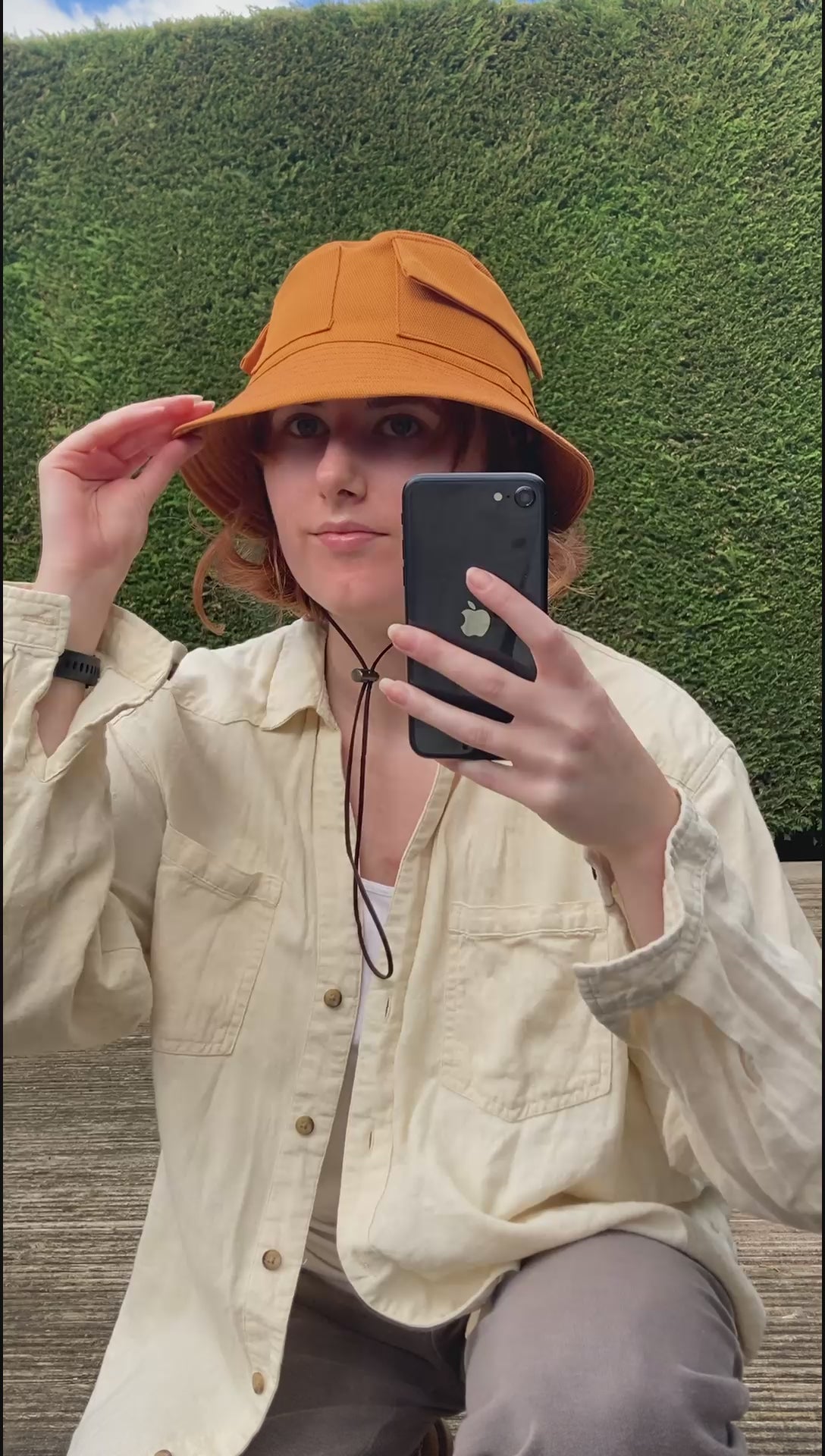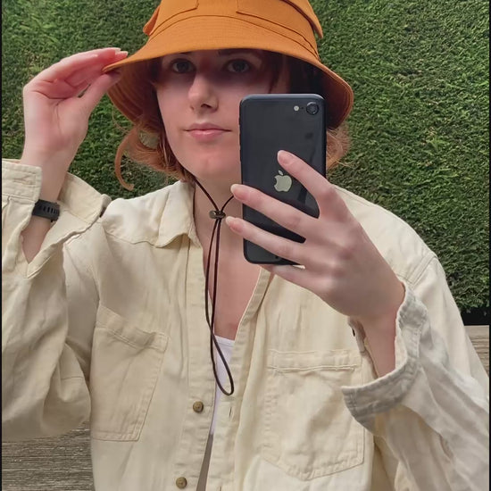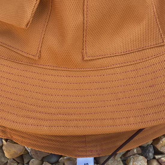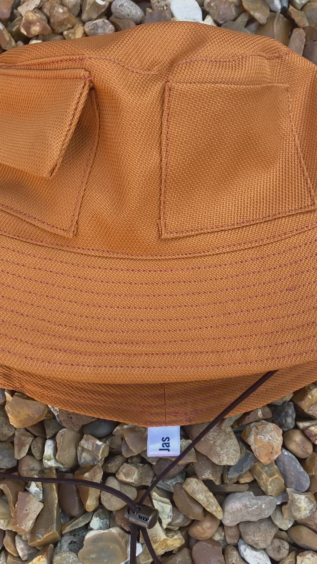 Textured water repellant utility stash bucket hat with detachable toggle chin strap and four mini patch pockets.